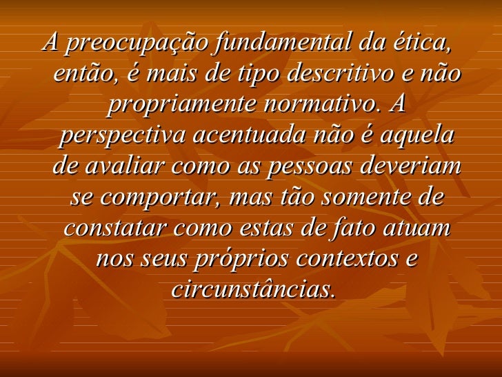 14. 29. <ul><li>A preocupação fundamental da ética, então, é mais de tipo descritivo e não propriamente normativo. A perspectiva acentuada não é aquela de avaliar como as pessoas deveriam se comportar, mas tão somente de constatar como estas de fato atuam nos seus próprios contextos e circunstâncias. </li></ul>