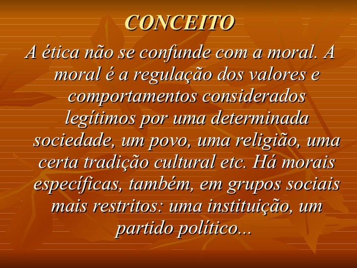 3. 3. CONCEITO <ul><li>A ética não se confunde com a moral. A moral é a regulação dos valores e comportamentos considerados legítimos por uma determinada sociedade, um povo, uma religião, uma certa tradição cultural etc. Há morais específicas, também, em grupos sociais mais restritos: uma instituição, um partido político... </li></ul>