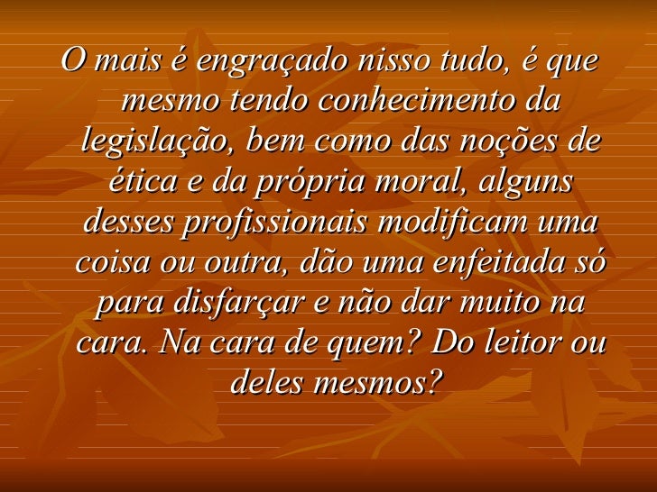15. 31. <ul><li>O mais é engraçado nisso tudo, é que mesmo tendo conhecimento da legislação, bem como das noções de ética e da própria moral, alguns desses profissionais modificam uma coisa ou outra, dão uma enfeitada só para disfarçar e não dar muito na cara. Na cara de quem? Do leitor ou deles mesmos? </li></ul>