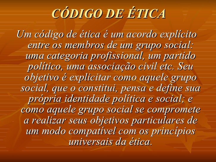 17. 35. CÓDIGO DE ÉTICA <ul><li>Um código de ética é um acordo explícito entre os membros de um grupo social: uma categoria profissional, um partido político, uma associação civil etc. Seu objetivo é explicitar como aquele grupo social, que o constitui, pensa e define sua própria identidade política e social; e como aquele grupo social se compromete a realizar seus objetivos particulares de um modo compatível com os princípios universais da ética. </li></ul>
