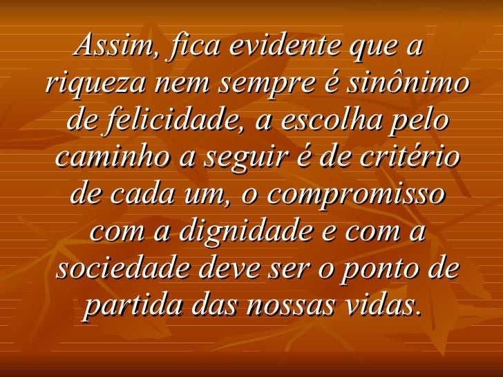 19. 37. <ul><li>Assim, fica evidente que a riqueza nem sempre é sinônimo de felicidade, a escolha pelo caminho a seguir é de critério de cada um, o compromisso com a dignidade e com a sociedade deve ser o ponto de partida das nossas vidas. </li></ul>