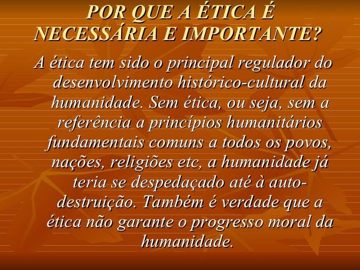 4. 4. POR QUE A ÉTICA É NECESSÁRIA E IMPORTANTE? <ul><li>A ética tem sido o principal regulador do desenvolvimento histórico-cultural da humanidade. Sem ética, ou seja, sem a referência a princípios humanitários fundamentais comuns a todos os povos, nações, religiões etc, a humanidade já teria se despedaçado até à auto-destruição. Também é verdade que a ética não garante o progresso moral da humanidade. </li></ul>