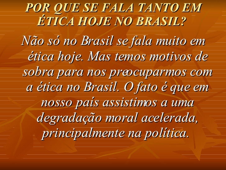 5. 5. POR QUE SE FALA TANTO EM ÉTICA HOJE NO BRASIL? <ul><li>Não só no Brasil se fala muito em ética hoje. Mas temos motivos de sobra para nos preocuparmos com a ética no Brasil. O fato é que em nosso país assistimos a uma degradação moral acelerada, principalmente na política. </li></ul>