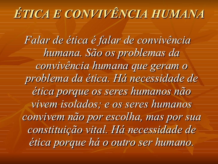 7. 7. ÉTICA E CONVIVÊNCIA HUMANA <ul><li>Falar de ética é falar de convivência humana. São os problemas da convivência humana que geram o problema da ética. Há necessidade de ética porque os seres humanos não vivem isolados; e os seres humanos convivem não por escolha, mas por sua constituição vital. Há necessidade de ética porque há o outro ser humano. </li></ul>