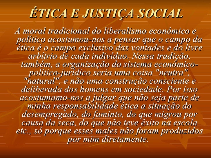 8. 9. ÉTICA E JUSTIÇA SOCIAL <ul><li>A moral tradicional do liberalismo econômico e político acostumou-nos a pensar que o campo da ética é o campo exclusivo das vontades e do livre arbítrio de cada indivíduo. Nessa tradição, também, a organização do sistema econômico-político-jurídico seria uma coisa &quot;neutra&quot;, &quot;natural&quot;, e não uma construção consciente e deliberada dos homens em sociedade. Por isso acostumamo-nos a julgar que não seja parte de minha responsabilidade ética a situação do desempregado, do faminto, do que migrou por causa da seca, do que não teve êxito na escola etc., só porque esses males não foram produzidos por mim diretamente. </li></ul>