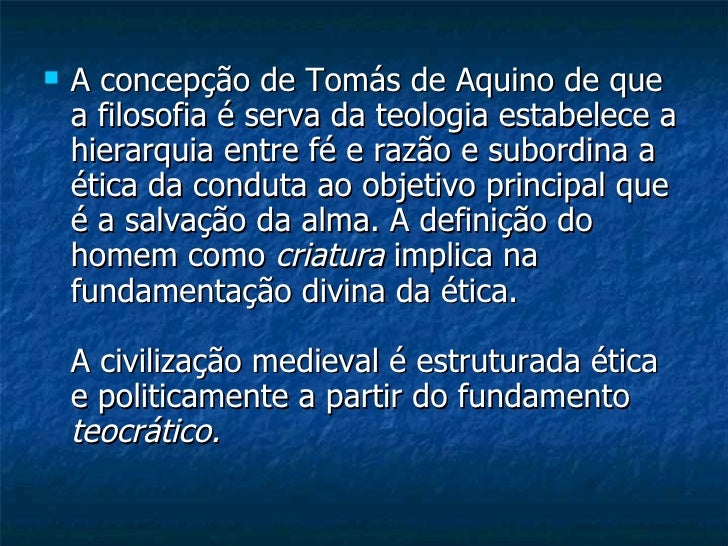 12. 12. <ul><li>A concepção de Tomás de Aquino de que a filosofia é serva da teologia estabelece a hierarquia entre fé e razão e subordina a ética da conduta ao objetivo principal que é a salvação da alma. A definição do homem como criatura implica na fundamentação divina da ética. A civilização medieval é estruturada ética e politicamente a partir do fundamento teocrático. </li></ul>