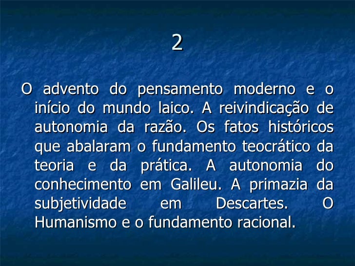 13. 13. 2 <ul><li>O advento do pensamento moderno e o início do mundo laico. A reivindicação de autonomia da razão. Os fatos históricos que abalaram o fundamento teocrático da teoria e da prática. A autonomia do conhecimento em Galileu. A primazia da subjetividade em Descartes. O Humanismo e o fundamento racional. </li></ul>