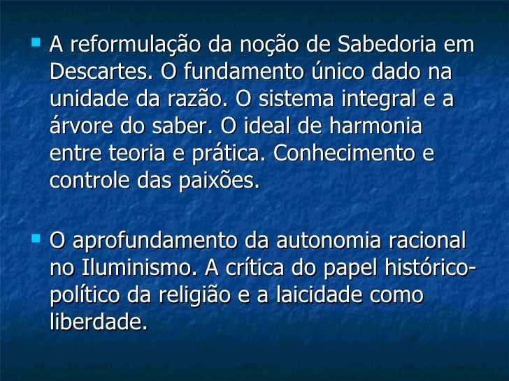 14. 14. <ul><li>A reformulação da noção de Sabedoria em Descartes. O fundamento único dado na unidade da razão. O sistema integral e a árvore do saber. O ideal de harmonia entre teoria e prática. Conhecimento e controle das paixões. </li></ul><ul><li>O aprofundamento da autonomia racional no Iluminismo. A crítica do papel histórico-político da religião e a laicidade como liberdade. </li></ul>