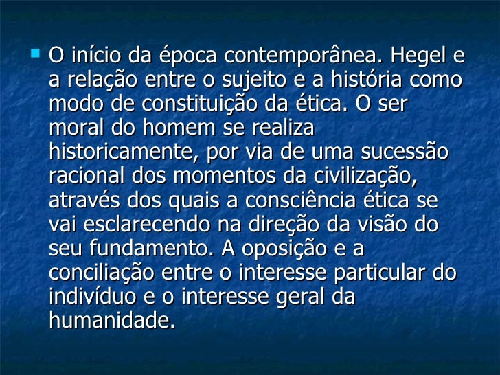 16. 16. <ul><li>O início da época contemporânea. Hegel e a relação entre o sujeito e a história como modo de constituição da ética. O ser moral do homem se realiza historicamente, por via de uma sucessão racional dos momentos da civilização, através dos quais a consciência ética se vai esclarecendo na direção da visão do seu fundamento. A oposição e a conciliação entre o interesse particular do indivíduo e o interesse geral da humanidade. </li></ul>