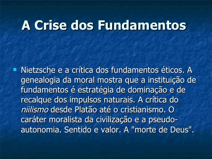 17. 17. A Crise dos Fundamentos <ul><li>Nietzsche e a crítica dos fundamentos éticos. A genealogia da moral mostra que a instituição de fundamentos é estratégia de dominação e de recalque dos impulsos naturais. A crítica do niilismo desde Platão até o cristianismo. O caráter moralista da civilização e a pseudo-autonomia. Sentido e valor. A &quot;morte de Deus&quot;. </li></ul>