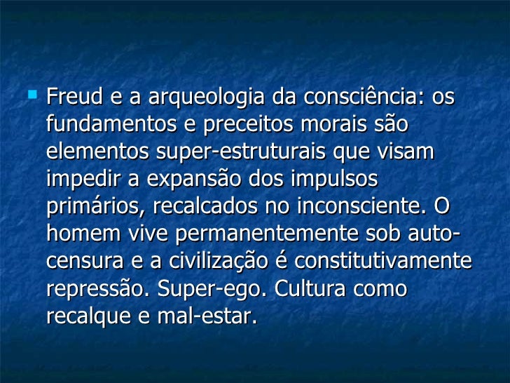 18. 18. <ul><li>Freud e a arqueologia da consciência: os fundamentos e preceitos morais são elementos super-estruturais que visam impedir a expansão dos impulsos primários, recalcados no inconsciente. O homem vive permanentemente sob auto-censura e a civilização é constitutivamente repressão. Super-ego. Cultura como recalque e mal-estar. </li></ul>