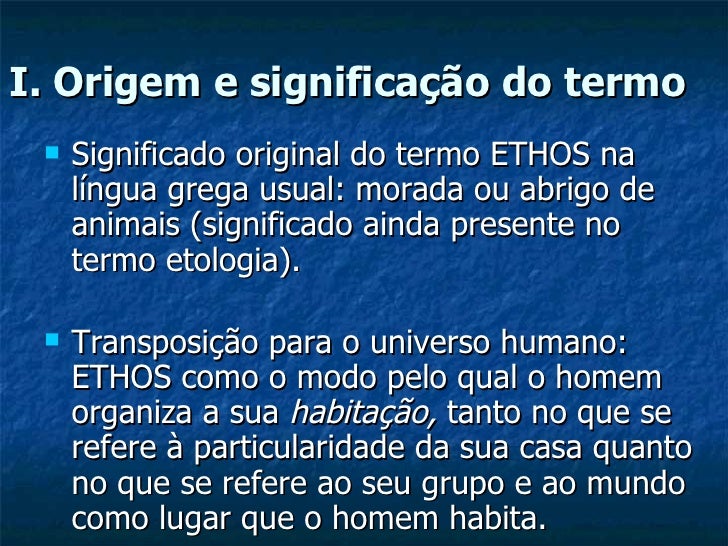 2. 2. I. Origem e significação do termo <ul><li>Significado original do termo ETHOS na língua grega usual: morada ou abrigo de animais (significado ainda presente no termo etologia). </li></ul><ul><li>Transposição para o universo humano: ETHOS como o modo pelo qual o homem organiza a sua habitação, tanto no que se refere à particularidade da sua casa quanto no que se refere ao seu grupo e ao mundo como lugar que o homem habita. </li></ul>