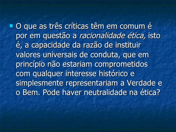 20. 20. <ul><li>O que as três críticas têm em comum é por em questão a racionalidade ética, isto é, a capacidade da razão de instituir valores universais de conduta, que em princípio não estariam comprometidos com qualquer interesse histórico e simplesmente representariam a Verdade e o Bem. Pode haver neutralidade na ética? </li></ul>