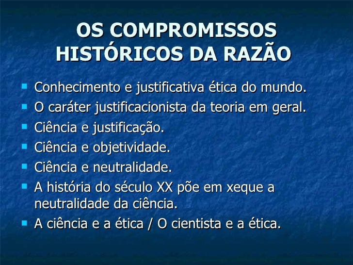 21. 21. OS COMPROMISSOS HISTÓRICOS DA RAZÃO <ul><li>Conhecimento e justificativa ética do mundo. </li></ul><ul><li>O caráter justificacionista da teoria em geral. </li></ul><ul><li>Ciência e justificação. </li></ul><ul><li>Ciência e objetividade. </li></ul><ul><li>Ciência e neutralidade. </li></ul><ul><li>A história do século XX põe em xeque a neutralidade da ciência. </li></ul><ul><li>A ciência e a ética / O cientista e a ética. </li></ul>