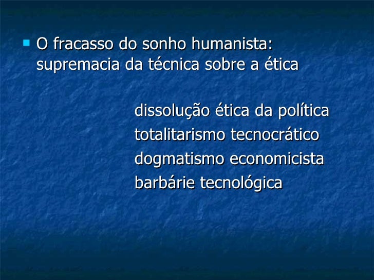 23. 23. <ul><li>O fracasso do sonho humanista: supremacia da técnica sobre a ética dissolução ética da política </li></ul><ul><li>totalitarismo tecnocrático </li></ul><ul><li>dogmatismo economicista </li></ul><ul><li>barbárie tecnológica </li></ul>