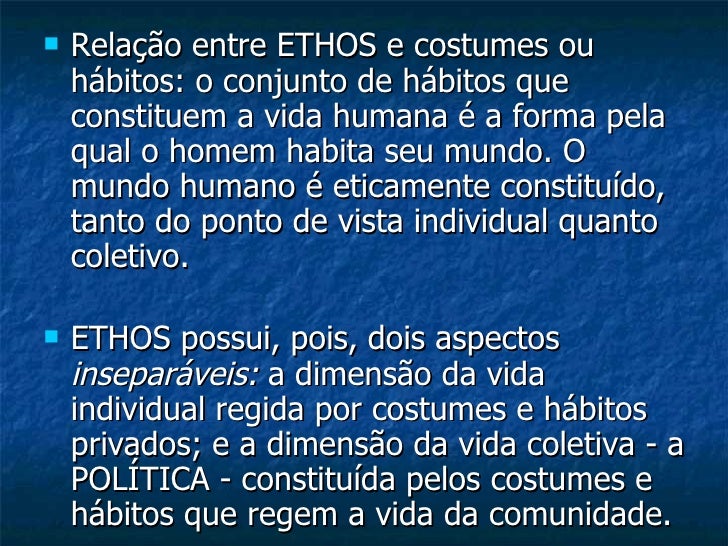 3. 3. <ul><li>Relação entre ETHOS e costumes ou hábitos: o conjunto de hábitos que constituem a vida humana é a forma pela qual o homem habita seu mundo. O mundo humano é eticamente constituído, tanto do ponto de vista individual quanto coletivo. </li></ul><ul><li>ETHOS possui, pois, dois aspectos inseparáveis: a dimensão da vida individual regida por costumes e hábitos privados; e a dimensão da vida coletiva - a POLÍTICA - constituída pelos costumes e hábitos que regem a vida da comunidade. </li></ul>