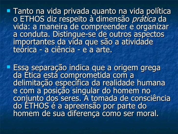 4. 4. <ul><li>Tanto na vida privada quanto na vida política o ETHOS diz respeito à dimensão prática da vida: a maneira de compreender e organizar a conduta. Distingue-se de outros aspectos importantes da vida que são a atividade teórica - a ciência - e a arte. </li></ul><ul><li>Essa separação indica que a origem grega da Ética está comprometida com a delimitação específica da realidade humana e com a posição singular do homem no conjunto dos seres. A tomada de consciência do ETHOS é a apreensão por parte do homem de sua diferença como ser moral. </li></ul>