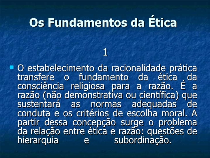5. 5. <ul><li>O estabelecimento da racionalidade prática transfere o fundamento da ética da consciência religiosa para a razão. É a razão (não demonstrativa ou científica) que sustentará as normas adequadas de conduta e os critérios de escolha moral. A partir dessa concepção surge o problema da relação entre ética e razão: questões de hierarquia e subordinação. </li></ul>Os Fundamentos da Ética 1