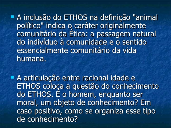 7. 7. <ul><li>A inclusão do ETHOS na definição &quot;animal político&quot; indica o caráter originalmente comunitário da Ética: a passagem natural do indivíduo à comunidade e o sentido essencialmente comunitário da vida humana. </li></ul><ul><li>A articulação entre racional idade e ETHOS coloca a questão do conhecimento do ETHOS. É o homem, enquanto ser moral, um objeto de conhecimento? Em caso positivo, como se organiza esse tipo de conhecimento? </li></ul>