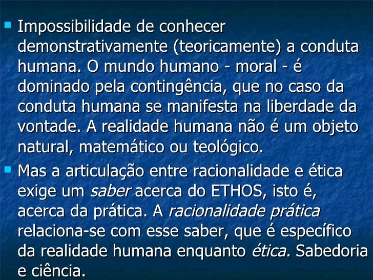 8. 8. <ul><li>Impossibilidade de conhecer demonstrativamente (teoricamente) a conduta humana. O mundo humano - moral - é dominado pela contingência, que no caso da conduta humana se manifesta na liberdade da vontade. A realidade humana não é um objeto natural, matemático ou teológico. </li></ul><ul><li>Mas a articulação entre racionalidade e ética exige um saber acerca do ETHOS, isto é, acerca da prática. A racionalidade prática relaciona-se com esse saber, que é específico da realidade humana enquanto ética. Sabedoria e ciência. </li></ul>