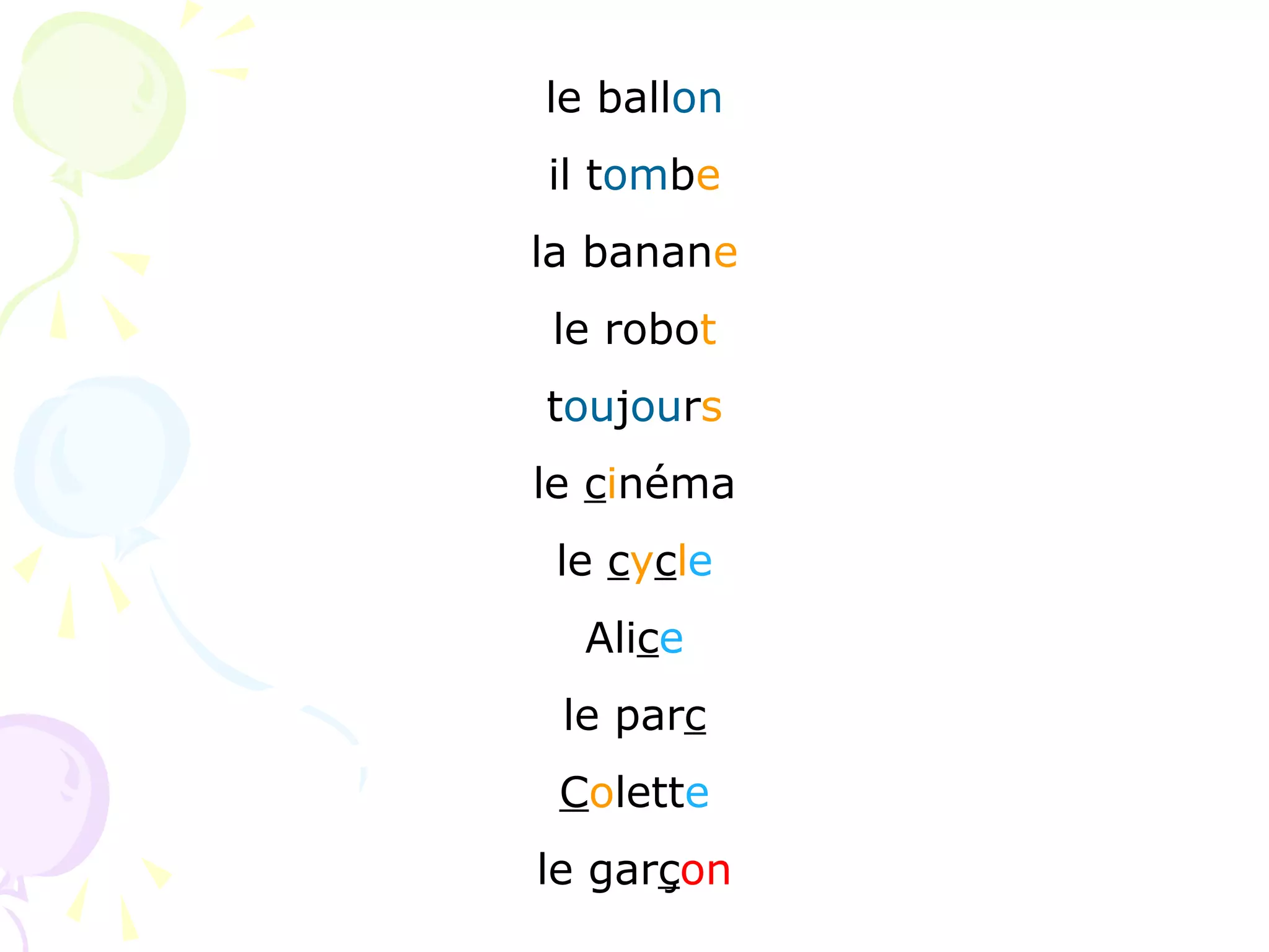 Le document présente une série de mots et d'expressions sans lien évident, évoquant des thèmes variés comme un ballon, un robot, le cinéma et des personnages tels qu'Alice et François. L'ensemble semble décrire des éléments de la vie quotidienne ou de l'imaginaire. Il n'y a pas de narration ou de propos cohérents.