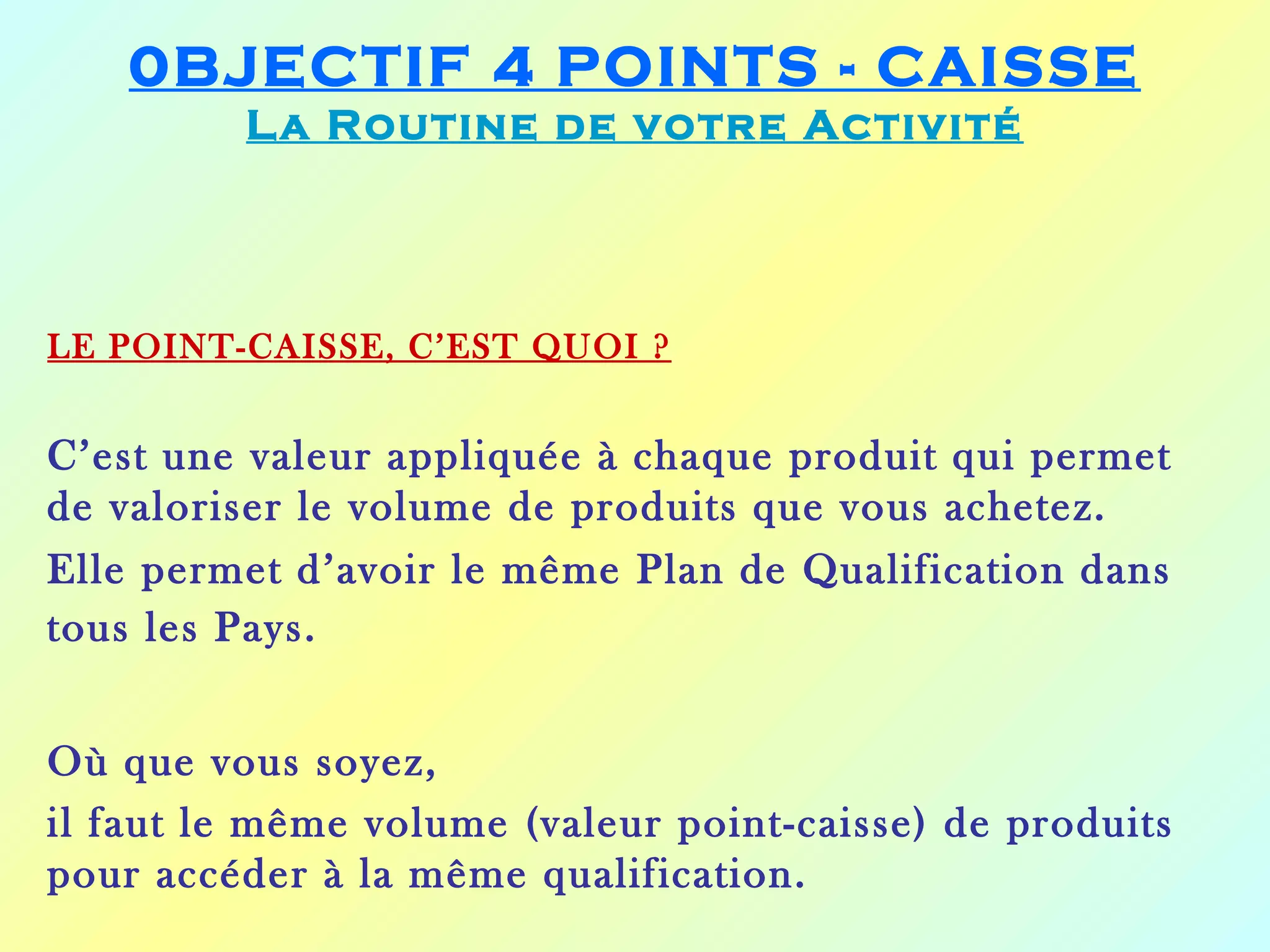 Le document détaille l'importance des 4 points-caisse pour devenir un distributeur actif et bénéficier des meilleures marges et remises. Il explique comment atteindre cet objectif par la consommation personnelle et la fidélisation des clients, tout en fournissant des exemples de gains potentiels. La qualification est essentielle pour augmenter les bénéfices et nécessitera le parrainage régulier de nouveaux distributeurs.