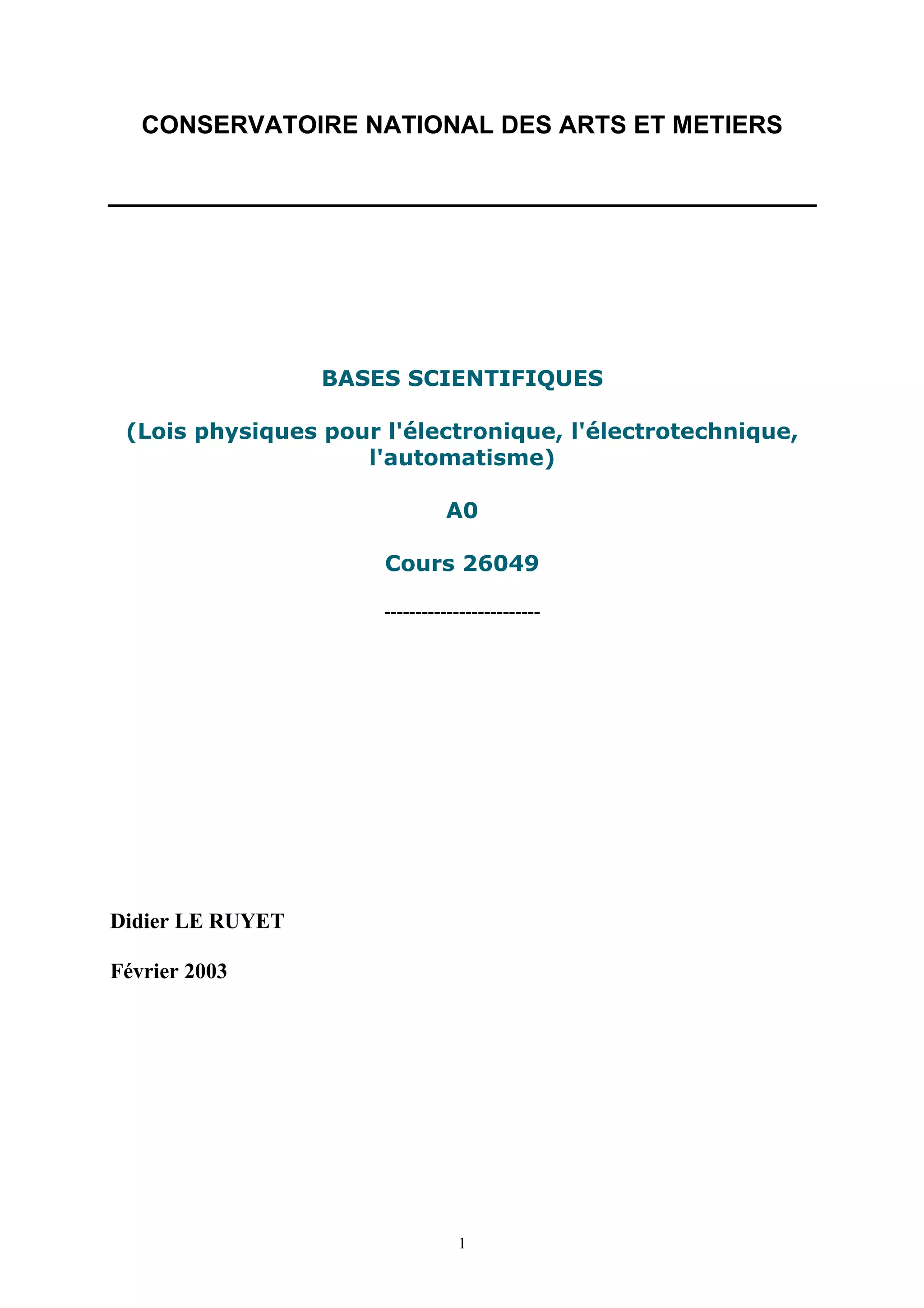 Le document présente un cours sur les bases scientifiques de l'électronique, abordant les concepts clés tels que l'électrocinétique, les dipôles passifs, et les lois fondamentales des circuits électriques. Il détaille également les propriétés des matériaux utilisés en électricité, tels que les conducteurs et les semi-conducteurs, et examine des éléments spécifiques comme la résistance, la bobine d'induction, et le condensateur. Enfin, le cours inclut des méthodes d'analyse de circuits et des théorèmes pertinents tels que ceux de Kirchhoff.