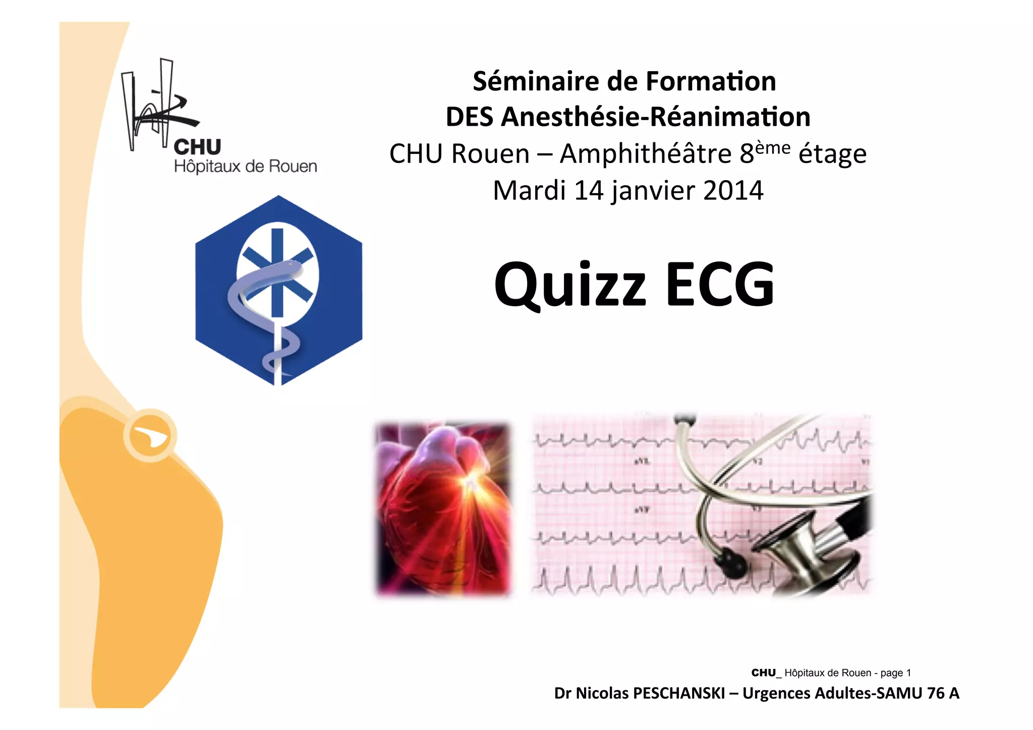 Ce document présente un séminaire sur l'électrocardiogramme (ECG) axé sur divers diagnostics tels que l'hypertrophie ventriculaire gauche, le syndrome de Brugada, et la péricardite aiguë. Il fournit des critères de diagnostic spécifiques pour plusieurs pathologies cardiaques, ainsi que des exemples d'ECG illustrant différentes situations cliniques. Les discussions incluent également des considérations sur les erreurs de diagnostic potentielles, en particulier en cas de blocs de branche.