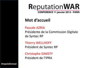 La conférence du 11 janvier 2013 à Paris, axée sur la guerre de la réputation, a rassemblé plusieurs experts pour discuter des stratégies de communication et de l'impact des nouvelles technologies. Des intervenants ont abordé des sujets variés tels que l'écoute des consommateurs, le dialogue avec les acteurs du changement, et la gestion de la marque employeur à l'ère numérique. La journée a également inclus des études sur la confiance envers les médias en période de crise et des tables rondes sur des thématiques clés du paysage communicationnel actuel.