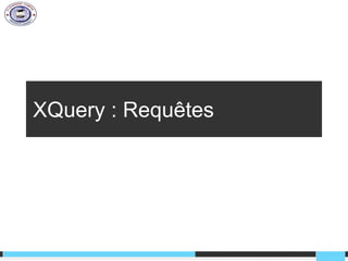 Le document traite des requêtes XQuery à réaliser sur des bases de données concernant des films et des artistes, avec des exercices pratiques pour extraire des informations variées. Il inclut des instructions pour obtenir des détails sur les personnages, les acteurs, et les films antérieurs à 2000, ainsi que des agrégations concernant les produits. De plus, il décrit la création de fonctions pour formater les favoris et les catégories associées, en utilisant des structures XML appropriées.