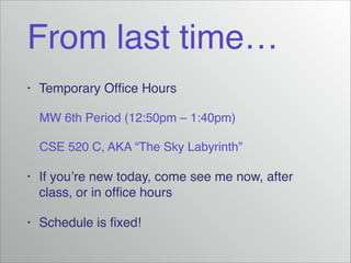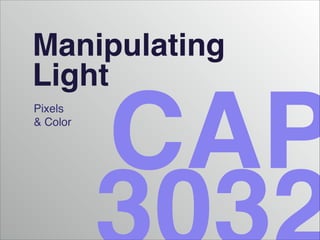 The document outlines temporary office hours and class activities for manipulating light pixels and colors using Processing. It details basic shapes, color modes, and the differences between standard and retina display image formats. Students are assigned readings from Shiffman's work to prepare for the next class.