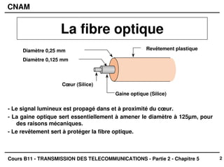 Le document traite des principes fondamentaux des fibres optiques, couvrant la distinction entre les fibres monomode et multimode, leur structure, et les mécanismes d'atténuation et de propagation des signaux lumineux. Il explique également les effets limitant la capacité de transmission, tels que l'atténuation et la dispersion chromatique, ainsi que les caractéristiques des fenêtres de propagation à différentes longueurs d'onde. Enfin, il aborde les aspects non linéaires de la propagation dans les fibres optiques et leur impact sur les performances du système de télécommunications.