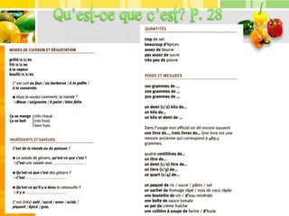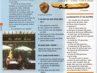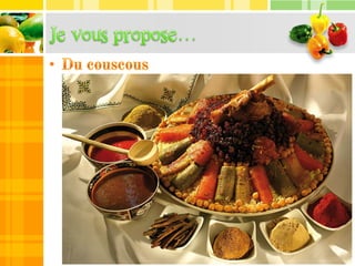 Le document mentionne divers aliments tels que des pâtes, des fruits de mer, du pain, du vin et du café. Il fait également référence à un repas à base de poisson au citron accompagné d'une salade. Une soirée couscous est également évoquée à plusieurs reprises.