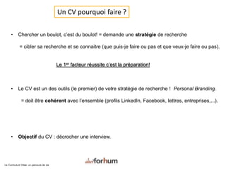 Le document explique l'importance d'un curriculum vitae (CV) dans la recherche d'emploi, en soulignant qu'il doit refléter clairement le parcours professionnel et les compétences d'un candidat. Il fournit des conseils pratiques sur la structure, le contenu et les erreurs à éviter lors de la rédaction d'un CV, afin d'attirer l'attention des recruteurs. Enfin, le document met en avant l'importance de la préparation et de la stratégie dans le processus de recherche d'emploi.