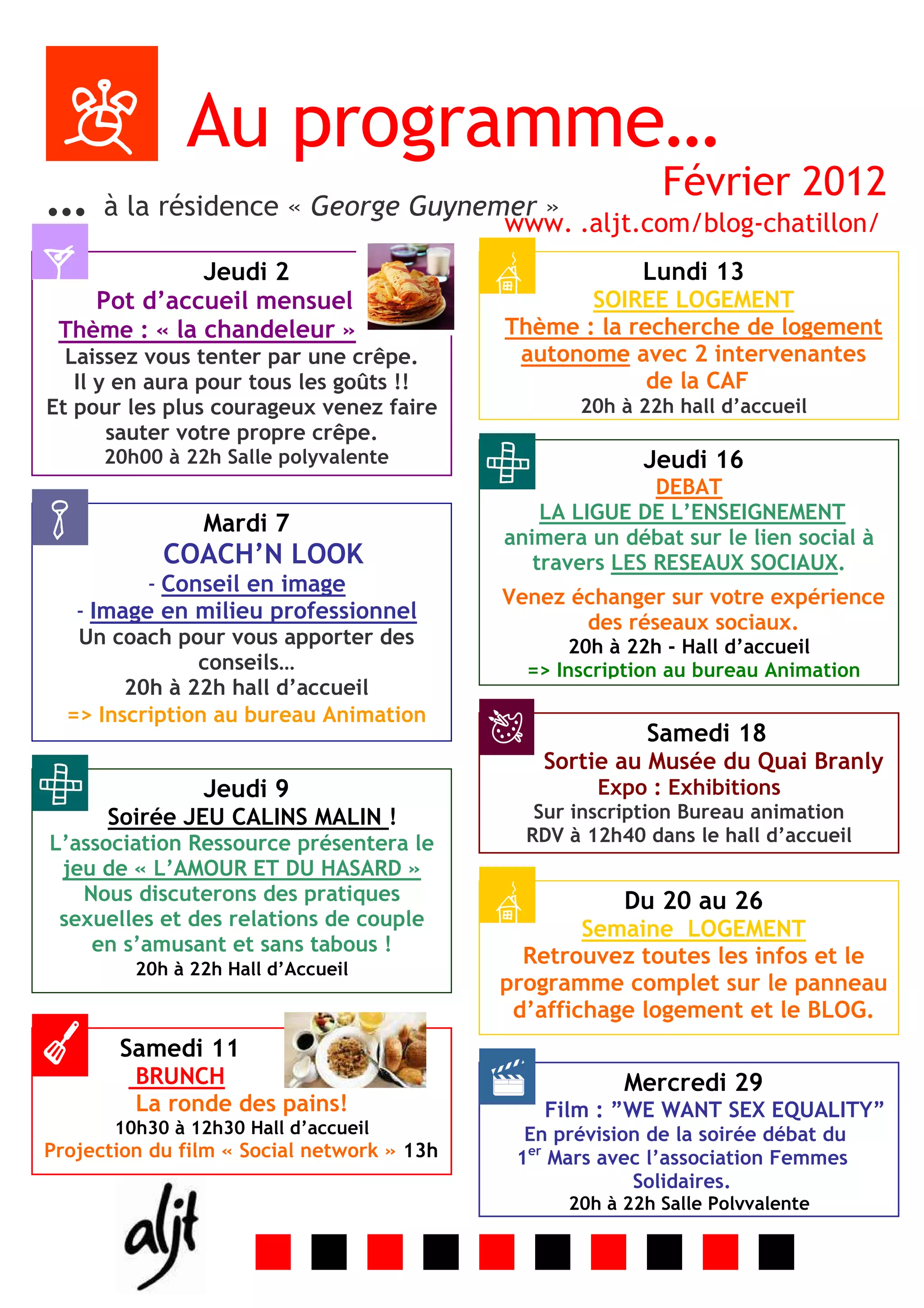 Le programme de février 2012 à la résidence George Guynemer propose diverses activités, incluant un pot d'accueil sur le thème de la Chandeleur, des débats sur le lien social et la recherche de logement, ainsi qu'une sortie au musée du quai Branly. En outre, des événements tels qu'un brunch et des projections de films sont organisés pour encourager les échanges autour de sujets sociaux et de couple. Les inscriptions pour les activités se font au bureau d'animation.