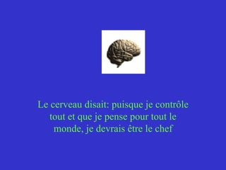 Ce récit humoristique explore la lutte entre les différentes parties du corps humain qui revendiquent le rôle de chef, aboutissant à une situation où le trou du cul, moqué au départ, réussit à prendre le pouvoir en raison de son refus de fonctionner. La morale souligne que la capacité à diriger n'est pas liée à l'intelligence, mais plutôt à la prise en charge des besoins essentiels. Ce document joue avec les concepts de leadership et de prise de décision de manière ludique.