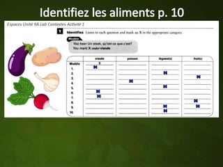 #7 1 IdentifiezListen to each question and mark an X in the appropriatecategory.modèle You hear: Un steak, qu’est-ce que c’est?You mark: an X under viande1. Une saucisse, qu’est-ce que c’est?2. Des petits pois, qu’est-ce que c’est?3. Des fraises, qu’est-ce que c’est?4. Du thon, qu’est-ce que c’est?5. Des haricots verts, qu’est-ce que c’est?6. Du poulet, qu’est-ce que c’est?7. Du porc, qu’est-ce que c’est?8. Des poires, qu’est-ce que c’est?9. Des poivrons rouges, qu’est-ce que c’est?10. Des pommes de terre, qu’est-ce que c’est?