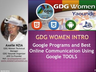 Le document présente les programmes offerts par Google pour les étudiants, tant en informatique qu'en général, ainsi que des outils de communication pour améliorer le travail collaboratif en ligne. Il inclut des exemples de cas pratiques avec Gmail, Hangouts et Google Drive, et met en avant des opportunités pour les femmes et d'autres groupes d'étudiants. Enfin, il mentionne l'organisation d'ateliers pratiques pour l'implémentation des Google Apps dans un événement prévu au Cameroun.