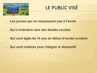 Le document décrit une structure éducative mise en place dans un collège isolé pour soutenir les élèves en difficulté scolaire, âgés de 14 ans, avec des objectifs de revalorisation et d'obtention de diplômes. Il mentionne différents moyens mis en œuvre, tels que des stages en entreprise et un soutien en mathématiques et français. Le bilan souligne les réussites, les difficultés rencontrées, ainsi que des points à améliorer, notamment la taille des groupes et la communication avec l'équipe éducative.