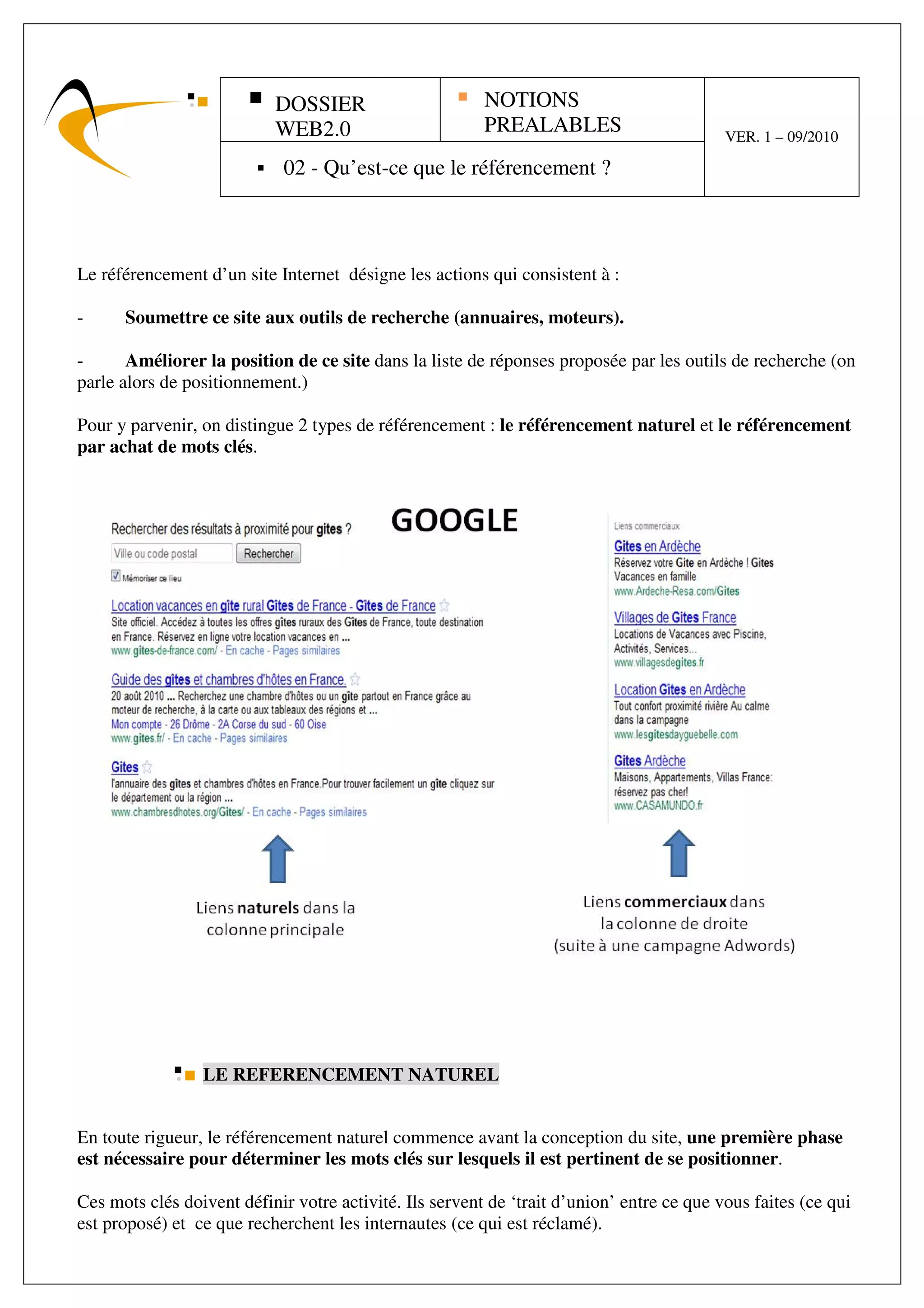 Le document traite du référencement web, qui inclut la soumission d'un site aux moteurs de recherche et l'amélioration de sa position dans les résultats. Il distingue le référencement naturel, basé sur la création de contenus pertinents et l'obtention de backlinks, du référencement payant par l'achat de mots clés. Enfin, il souligne l'importance de la qualité et de la régularité du contenu dans le contexte du web2.0.