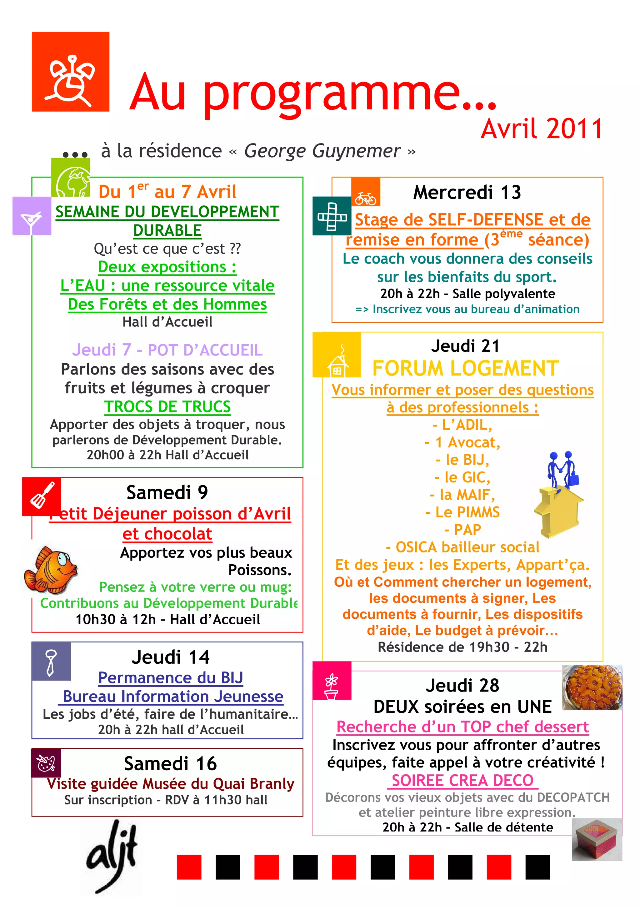 Le document décrit un programme d'activités à la résidence 'George Guynemer' du 1er au 28 avril 2011, incluant des séances de self-défense, des expositions sur le sport et l'eau, ainsi que des forums sur le logement et le développement durable. Des petits déjeuners, moments de troc et ateliers créatifs sont également prévus. Les événements visent à informer et à encourager la participation des résidents tout en promouvant une meilleure qualité de vie.
