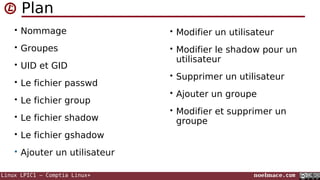 Le document traite de la gestion des utilisateurs et groupes sous Linux, incluant la création, modification et suppression d'utilisateurs et de groupes. Il détaille également les fichiers importants comme /etc/passwd, /etc/group, /etc/shadow et /etc/gshadow, ainsi que les commandes associées pour administrer ces éléments. Enfin, il fournit des informations sur les droits d'accès et la structure des identifiants d'utilisateur (UID) et de groupe (GID).