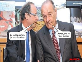 Le document est un diaporama humoristique mettant en scène François Hollande et des dialogues satiriques sur la politique française, la fiscalité et le chômage. Les personnages expriment leurs frustrations et leurs attentes concernant la situation économique, tout en critiquant les décisions gouvernementales. Le ton léger et comique cherche à divertir tout en abordant des thèmes sérieux de manière ironique.