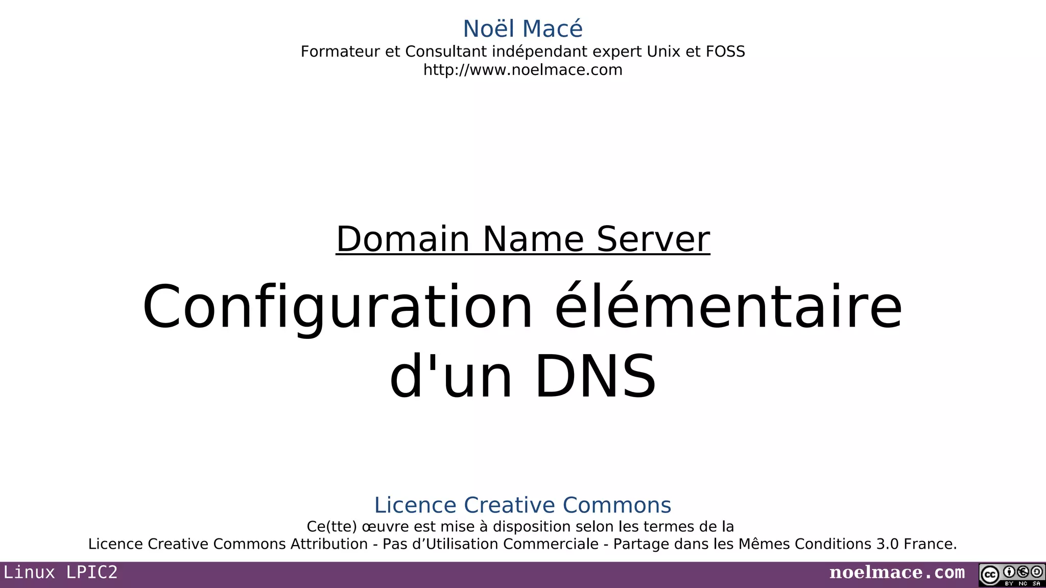 Ce document traite de la configuration d'un serveur DNS (Domain Name Server) en utilisant BIND, notamment sa hiérarchie, son fonctionnement et sa structure de fichiers. Il aborde également les options de configuration, la syntaxe des fichiers et les commandes pour gérer le serveur DNS. Enfin, il souligne l'importance de respecter les termes de la licence Creative Commons associée à l'œuvre.