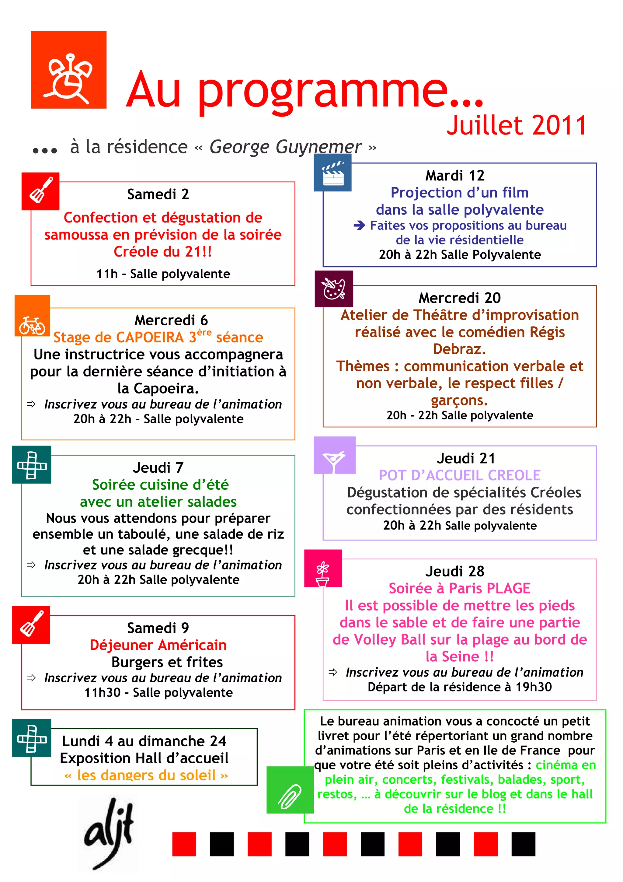 Le programme d'animations de la résidence 'George Guynemer' pour juillet 2011 comprend divers ateliers tels que du théâtre d'improvisation et de la capoeira, ainsi que des soirées de cuisine créole. Des activités comme des projections de films et des sorties à Paris plage sont également proposées, avec des inscriptions au bureau de l'animation. Un livret répertoriant les animations estivales à Paris et en Île-de-France est disponible pour les résidents.