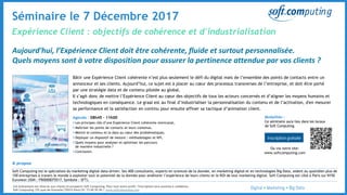 Le séminaire du 7 décembre 2017 aborde l'importance d'une expérience client cohérente, fluide et personnalisée, à travers l'intégration d'une stratégie data et de contenu. Soft Computing, spécialiste en marketing digital data-driven, souligne la nécessité de centraliser les données et d'améliorer les parcours clients pour optimiser la satisfaction et la performance. Les participants sont informés des méthodologies, KPI et outils pour construire et mesurer l'expérience client dans un environnement omnicanal.