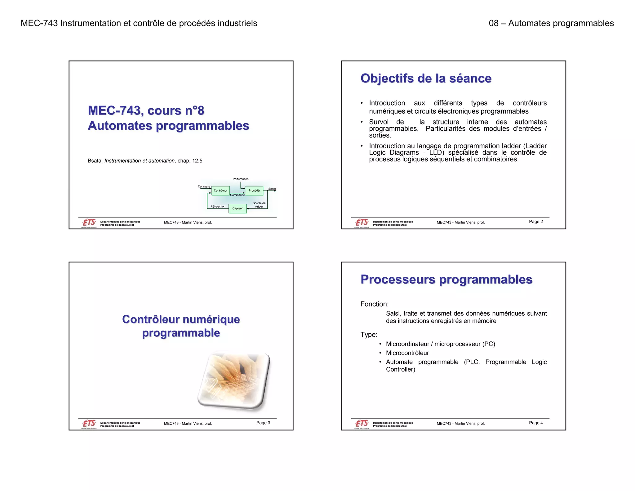 Le document présente une introduction aux automates programmables dans le contrôle de procédés industriels, incluant la structure interne, les types de contrôleurs numériques et le langage de programmation ladder. Il explique également les fonctions et l'architecture des automates, ainsi que les modules d'entrées/sorties et leur fonctionnement. Enfin, il aborde les types de mémoire utilisés dans ces systèmes et les différents types d'interfaces pour les capteurs et actionneurs.