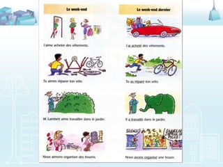Ce document aborde l'utilisation du passé composé en français, notamment la formation avec les verbes en -er et -ir. Il fournit des exemples concrets d'utilisation de ce temps verbal à travers des phrases et des exercices. Le texte inclut également une référence à des classements et activités quotidiennes comme la natation.