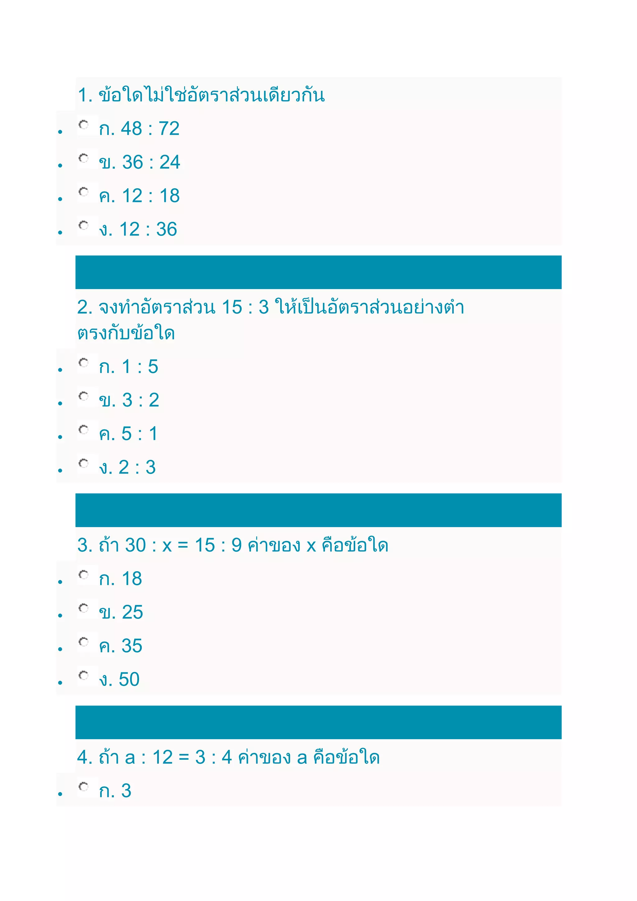 Le document présente une série de relations et de proportions mathématiques sous forme de séquences. Il contenait des équations impliquant des valeurs et des rapports, indiquant des relations entre différents nombres. Ces exemples montrent diverses façons de comprendre et d'analyser les rapports numériques.
