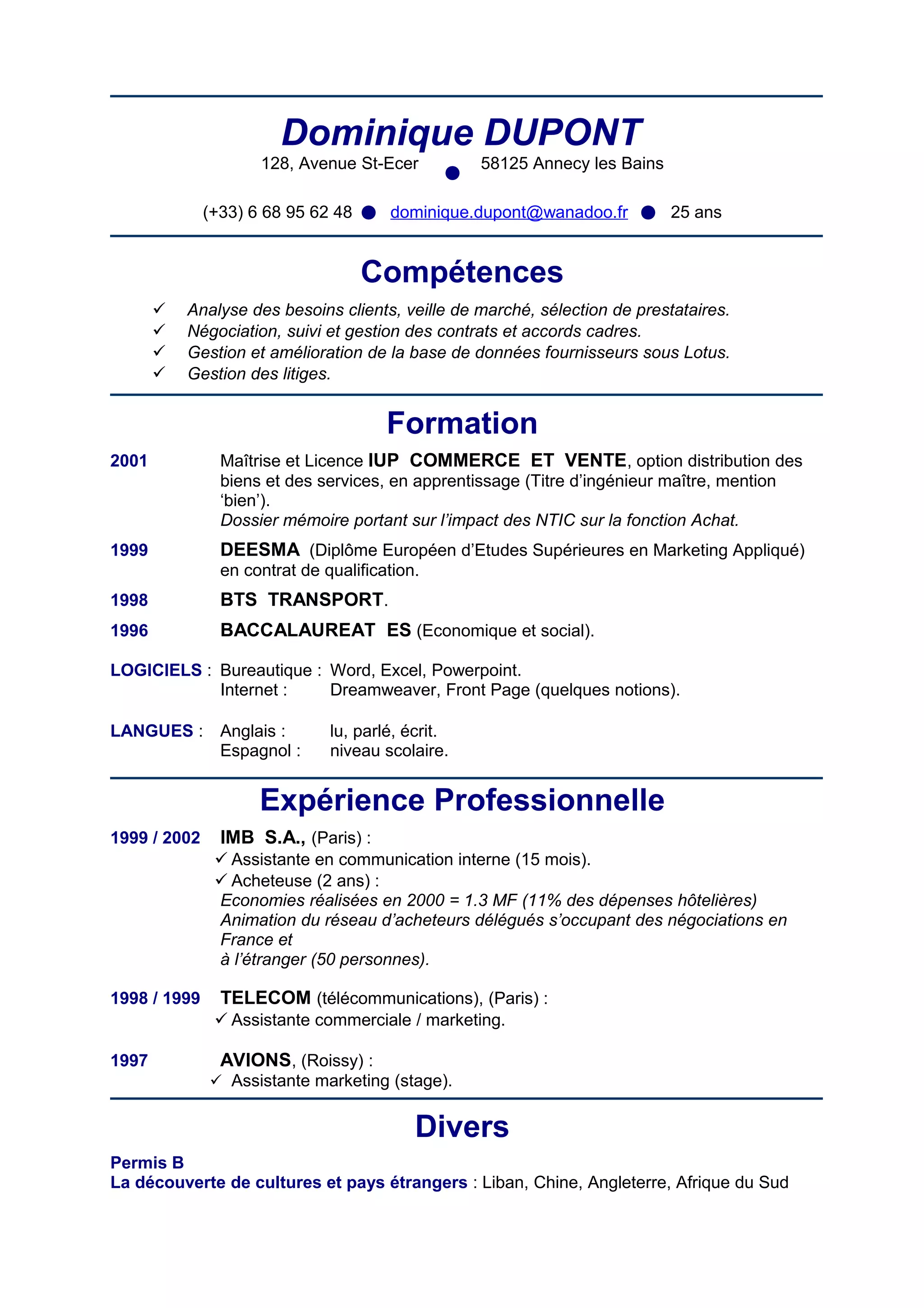 Dominique Dupont, 25 ans, possède une expertise en analyse des besoins clients, gestion des contrats et base de données fournisseurs. Formé en commerce, vente, et marketing, il a acquis une expérience significative en tant qu'acheteur et assistante dans divers secteurs. Il parle anglais et possède des connaissances en espagnol, ainsi qu'une familiarité avec plusieurs logiciels de bureautique et de développement web.